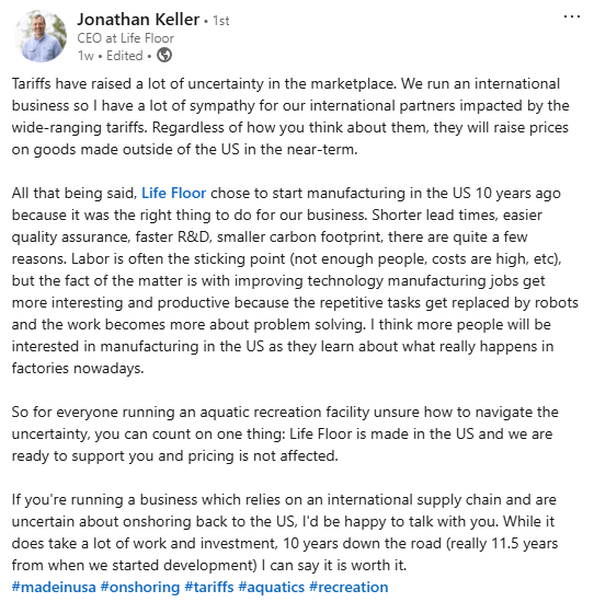 When I said last week I'd talk about tariffs this week, I didn't anticipate how much people already hate hearing that word (myself included). Most of my interactions with aquatic industry clients and colleagues this week suggest that it's starting to feel like COVID 2.0 where there's so much uncertainty day-to-day with endless updates and changes that it's difficult to track what's actually going on. To that end, my thoughts jotted down last week are now completely irrelevant.