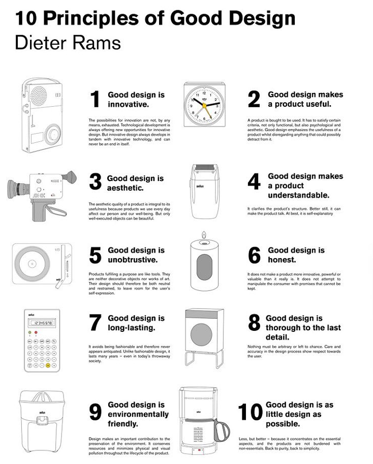 Recently I learned about Dieter Rams, a German industrial designer. You've probably seen some of his iconic designs without even realizing it. Two things he said that resonated with me: "Less, but better" and "indifference towards people and the reality in which they live is actually the one and only cardinal sin in design" (emphasis added). He also has a very famous series of 10 Design Principles.
