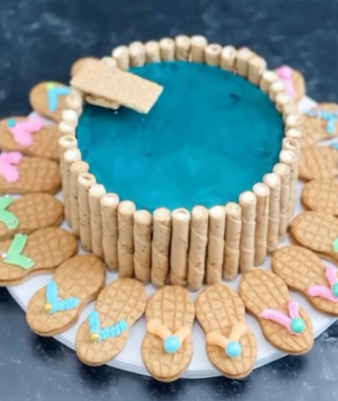 If you're looking for a different kind of cake for your next aquatic staff meeting, how about this simple blue Jell-O upgrade to a grocery store cake?